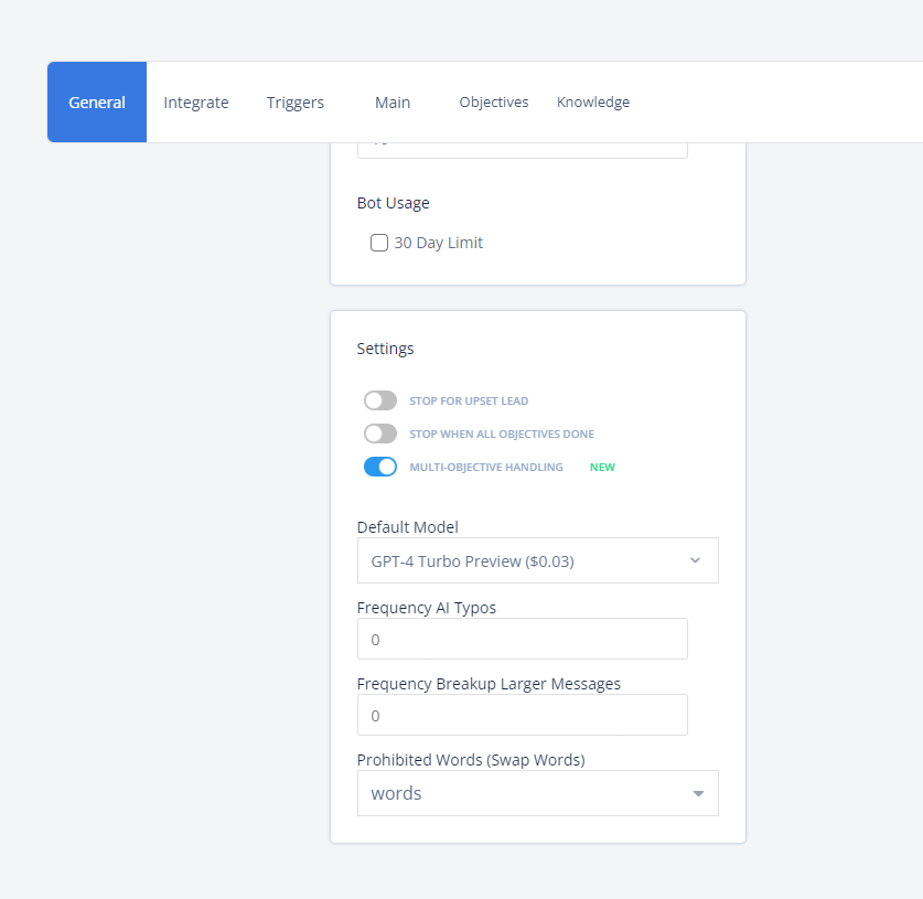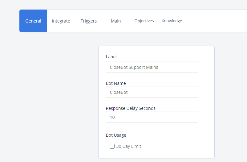 When you edit your bot, the first section you see is this General section, where you can tweak your overall bot behavior and give it a name and label.
