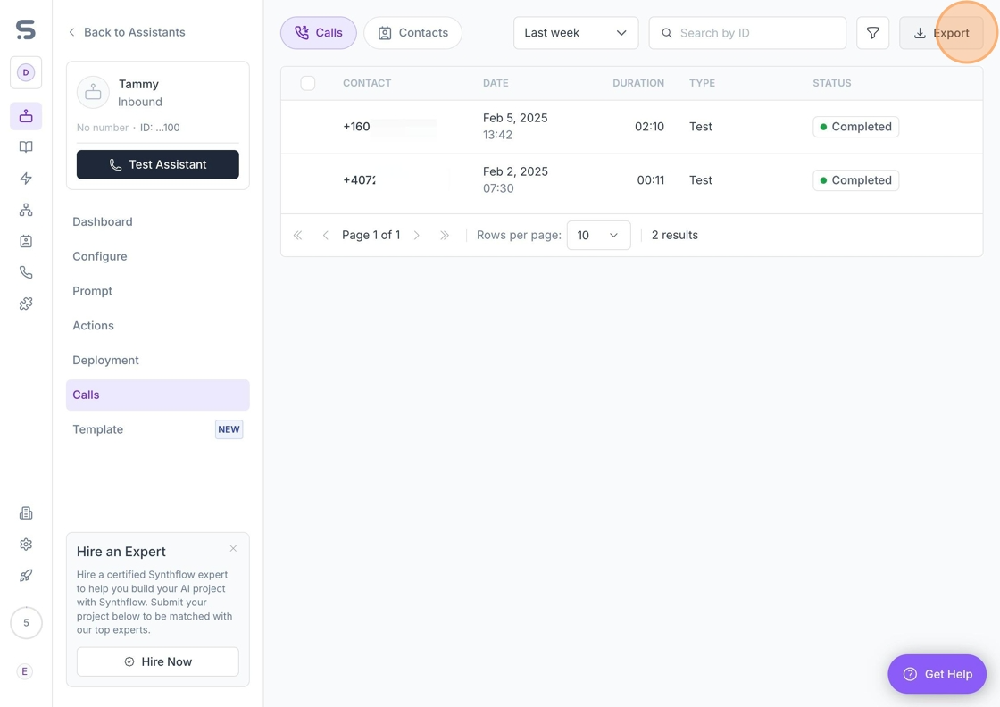 You can export your call logs as a CSV file for further analysis, record-keeping, or sharing with your team. This allows you to organize, filter, and analyze call data outside of the Synthflow AI platform.
