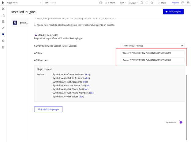 The Bubble.io Plugin allows you to leverage the power of Synthflow's capabilities within your Bubble.io applications.