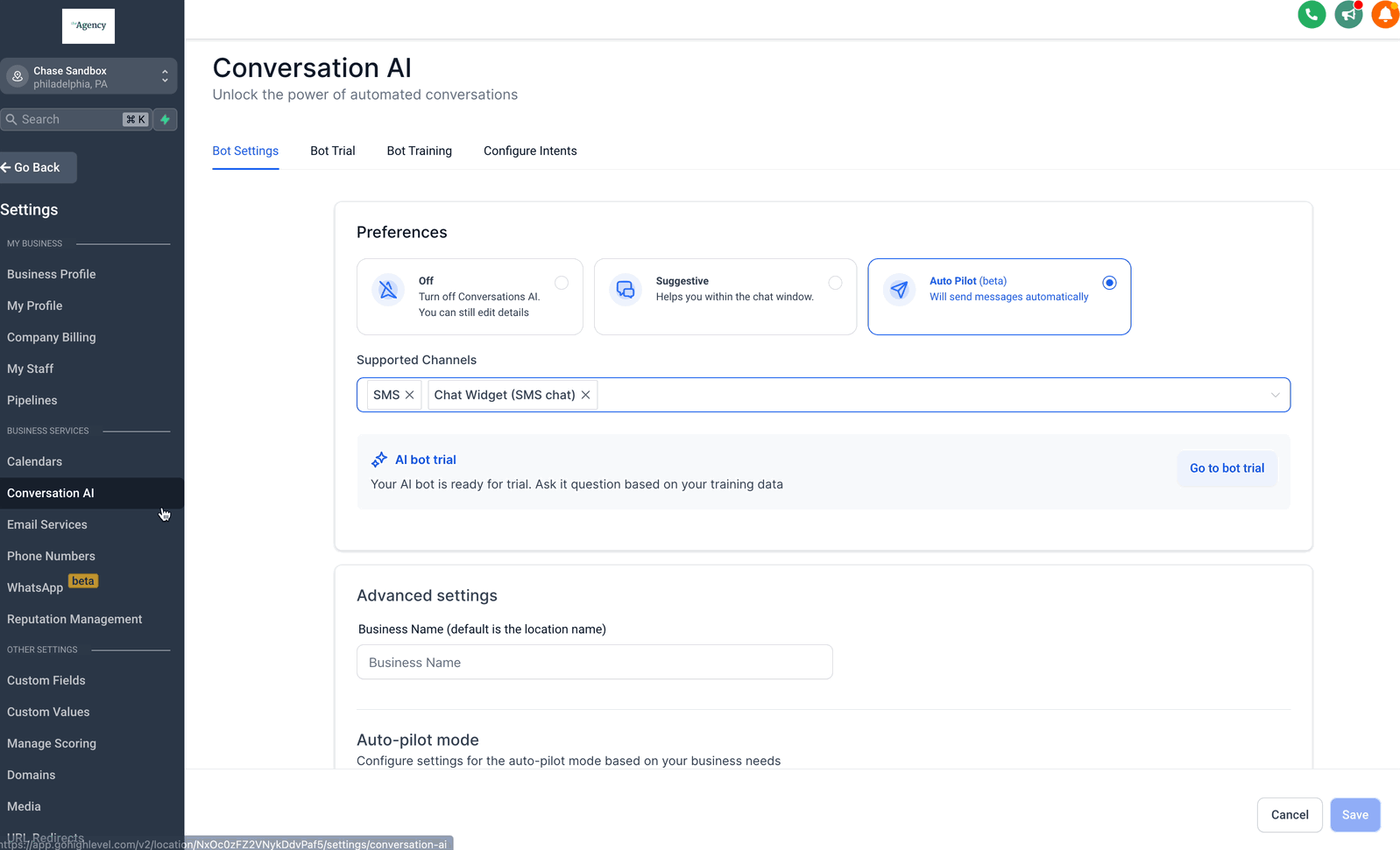- Navigate to the Conversation AI dashboard in your sub-account settings (Settings > Conversation AI)
