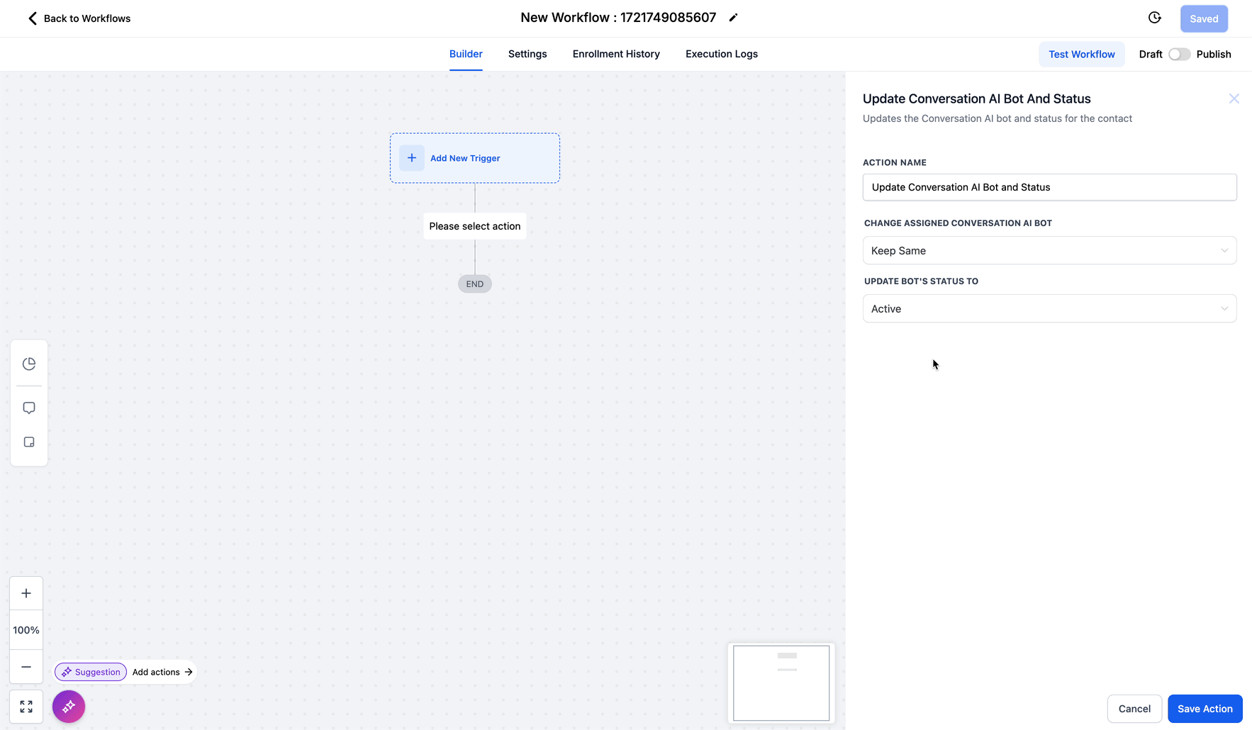 Utilize the power of your bot training within workflows by using the Conversation AI Action following: