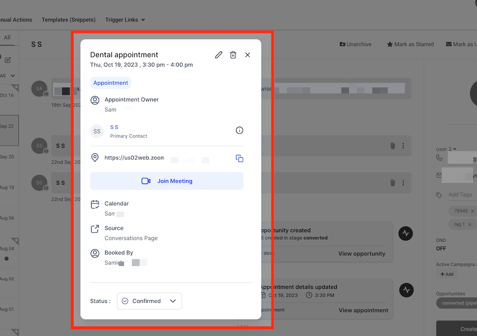 - Know Where the Appointment Was Created: Whether it was booked through a conversation, a funnel, or manually added, you’ll see the source of the booking along with who scheduled it.