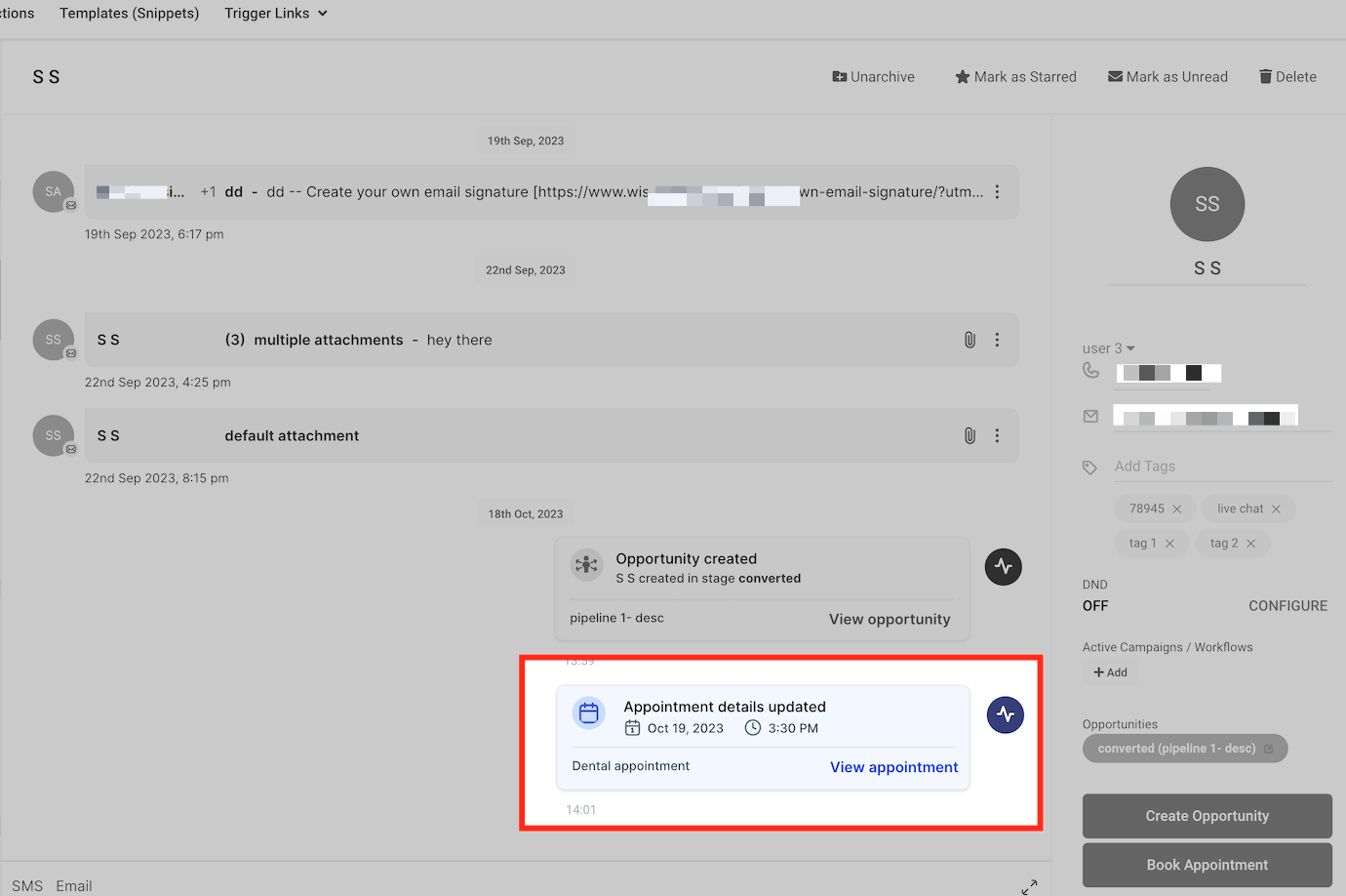 Activity Cards provide real-time updates on key interactions within the platform, eliminating the need to switch between different sections. Whether a new opportunity is created, an appointment is rescheduled, or an invoice is sent, these cards keep your team informed and allow instant access to relevant actions with just a click.