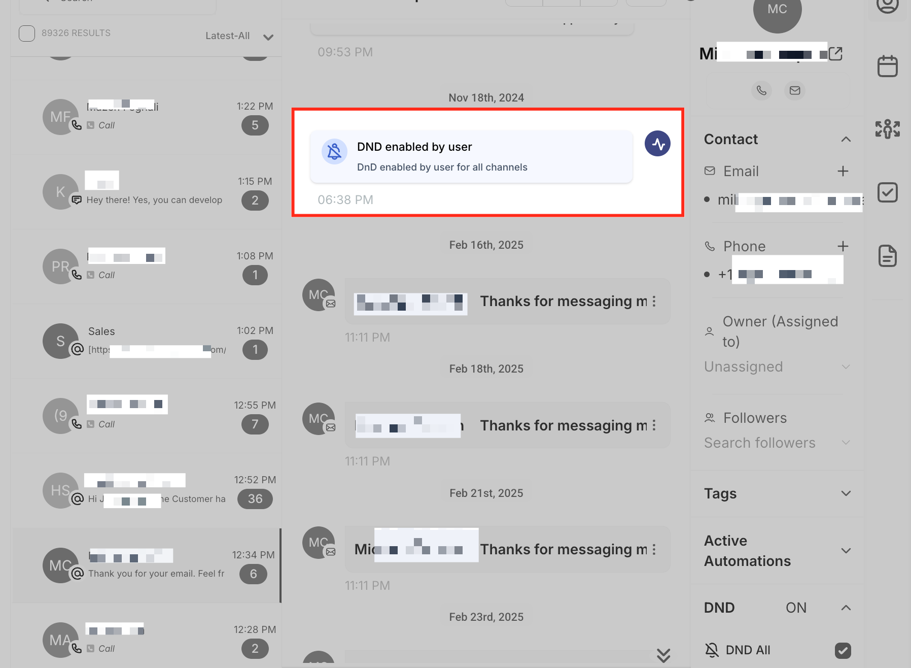 Activity Cards notify users when a contact is marked as Do Not Disturb (DND) or removed from the DND list. These notifications help maintain clarity on communication preferences, ensuring that users interact with contacts in the most appropriate manner.