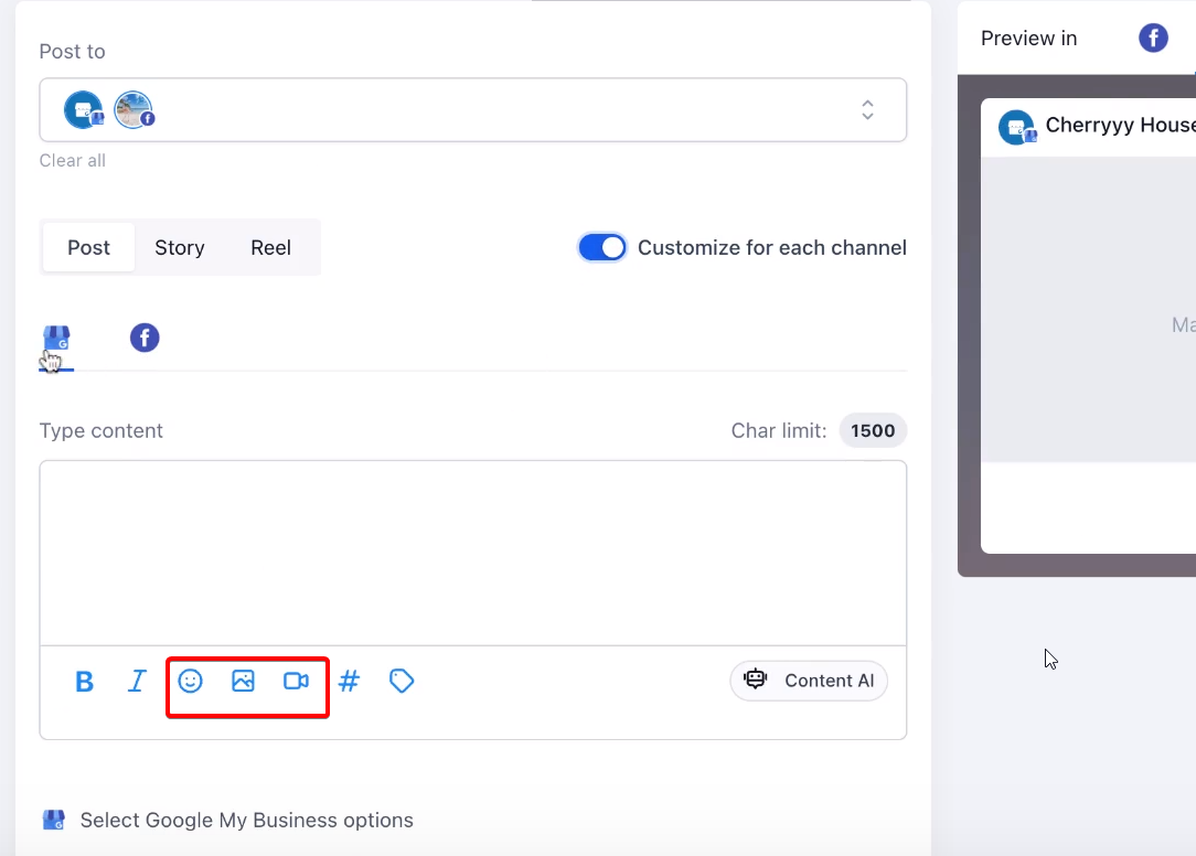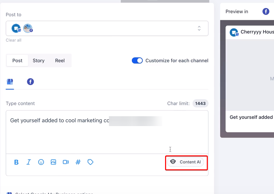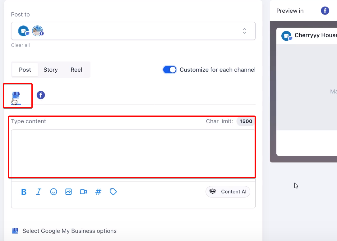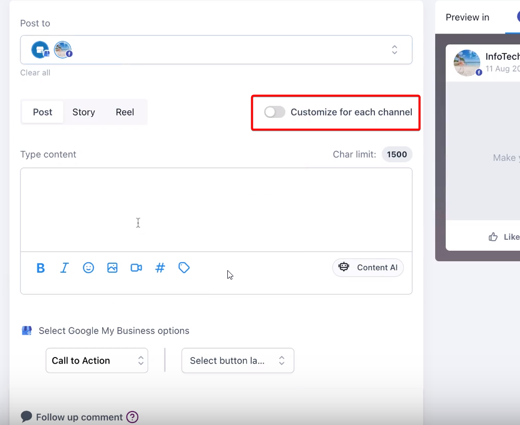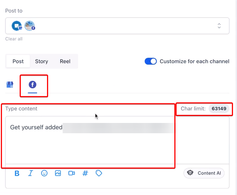 You can view and edit the content for different channels separately, ensuring that each post aligns with the platform's character limit and audience preferences.
