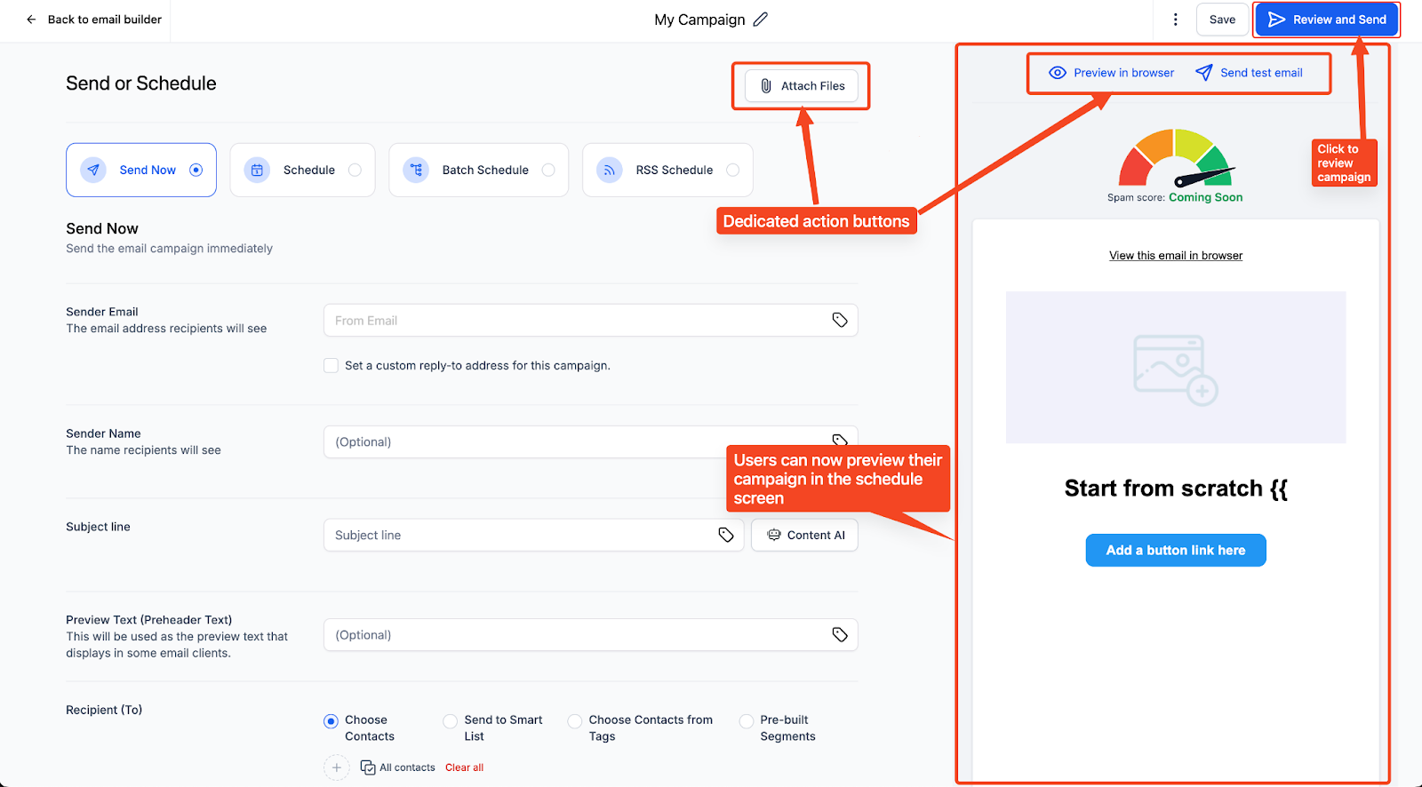 Improved UI of send or schedule screen: See your email design while composing the subject line and preview text for a smoother workflow.