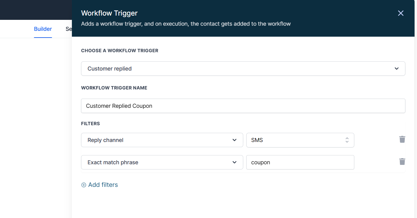 The key to SMS opt-in campaigns is your "Customer Replied" Workflow Trigger, which should look something like this: