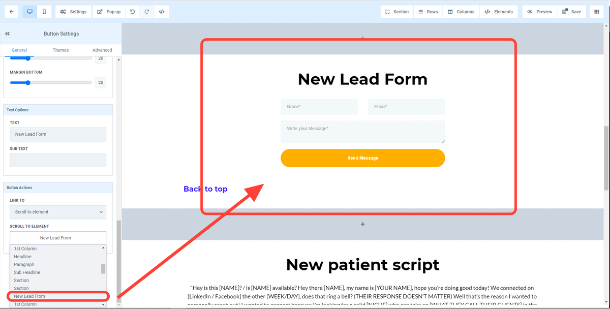 7. Proceed to the dropdown menu "scroll to element" option