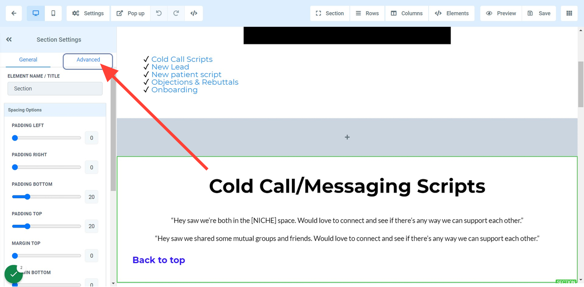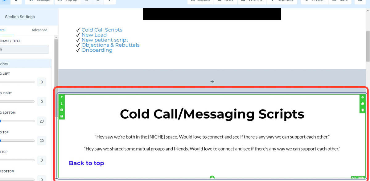 Click on the section you would like to anchor/ scroll too. Make sure the section or element is highlighted (green in this case).