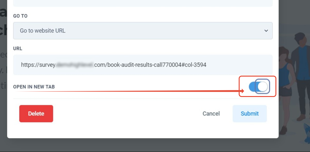 For this option if you would like to open the link in a new tab please toggle this feature on (blue).