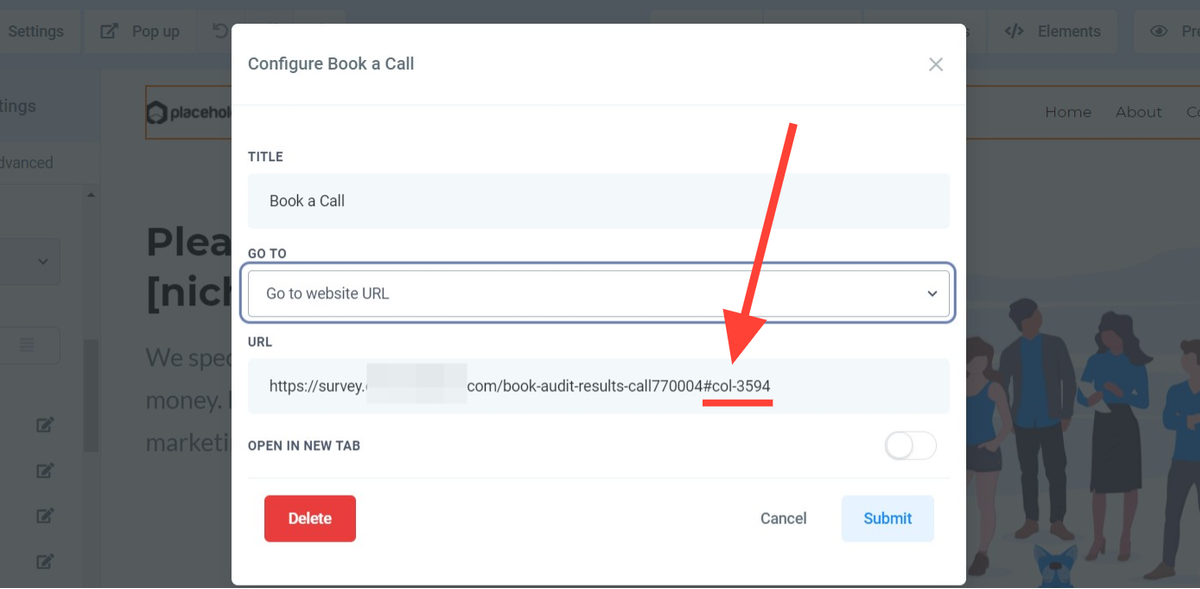 For this example we will anchor the "Book a Call" option to a booking widget section located in another funnel/ website.