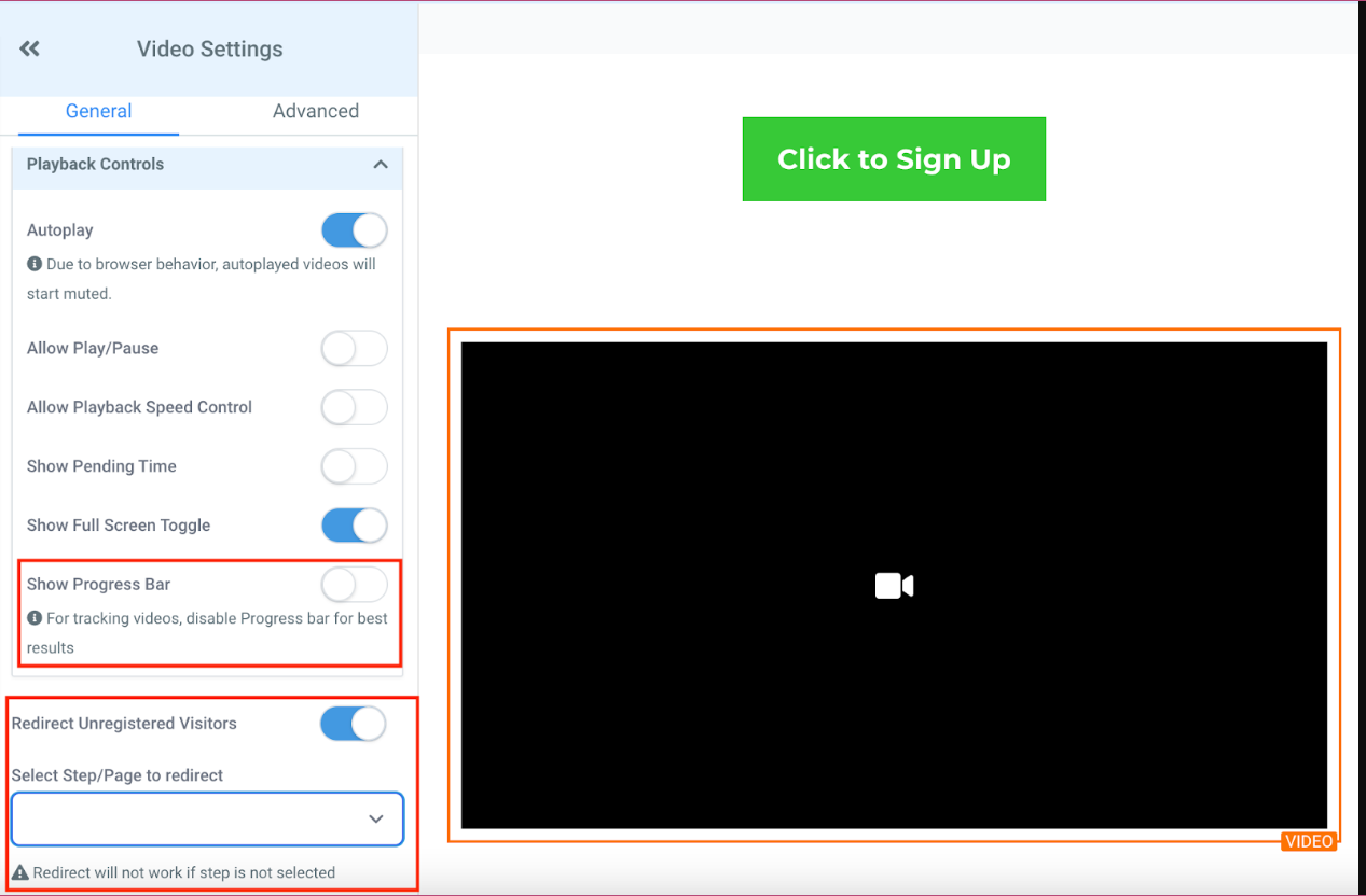 2. We recommend turning off Show Progress Bar in the Video Element settings so viewers cannot move back and forwards in a video, to assure accurate progress tracking.