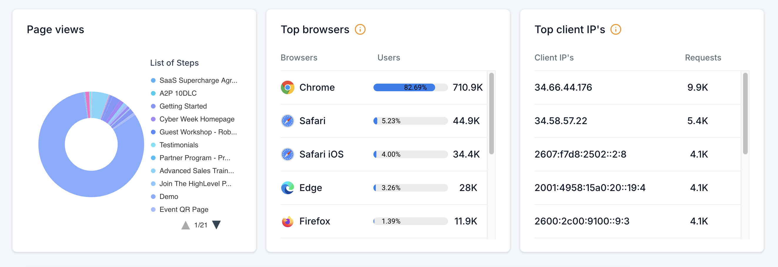 Understanding your website traffic is key to optimizing performance and security. With the latest update to the Funnels & Websites Analytics Dashboard, you can now see the Top Browsers and Top Client IPs accessing your site. This feature, available in the Page Views section, provides valuable insights into how visitors engage with your Funnels and Websites, helping you tailor your site for better performance and detect unusual traffic patterns.