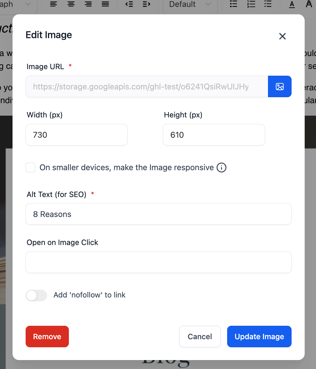 Option to add images with al text, define the width and height, it allows users to make it responsive to smaller screens, option to add link when someone clicks on the image. User can select the option to select the image from media library or from Content AI - Image.