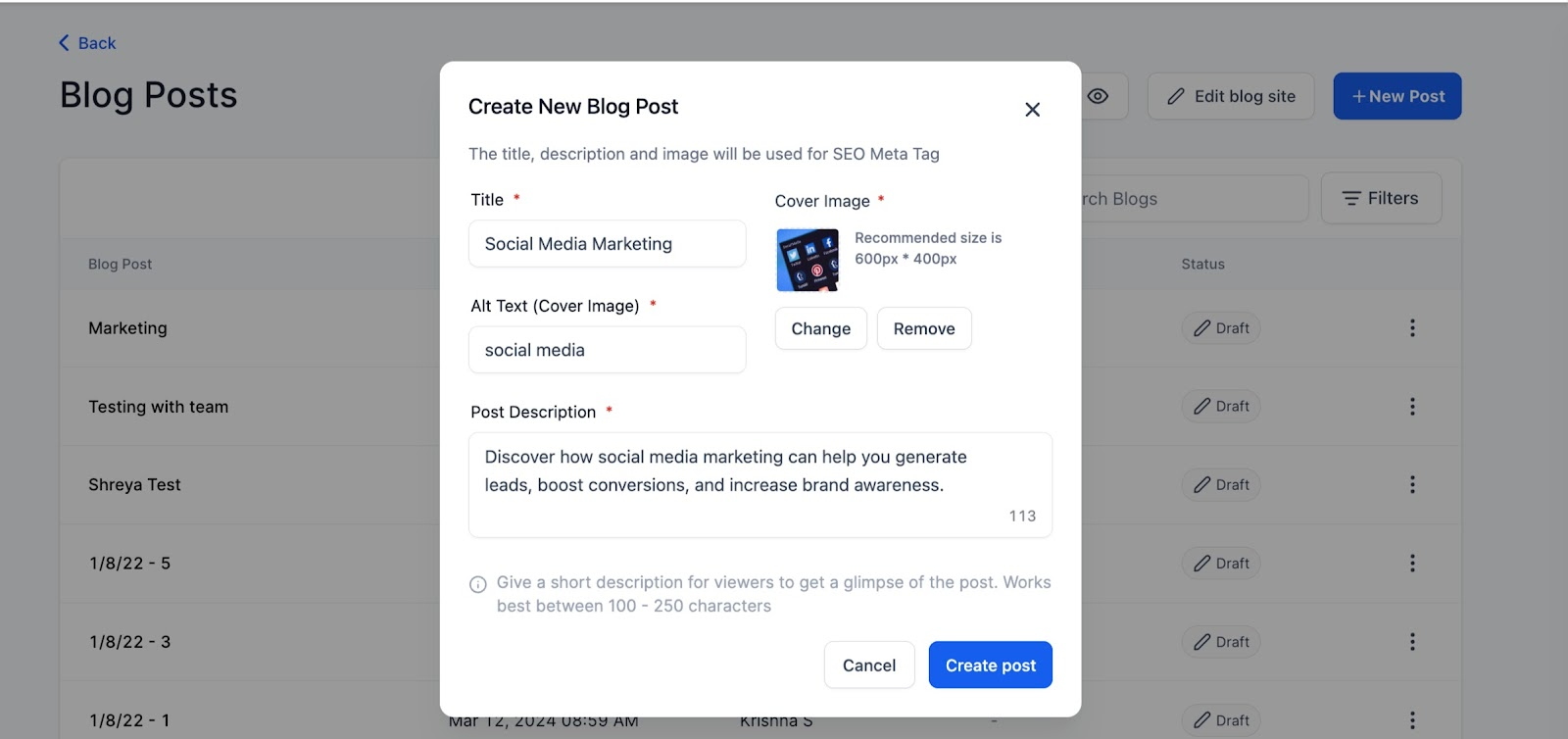 It will ask for the title of Blog post